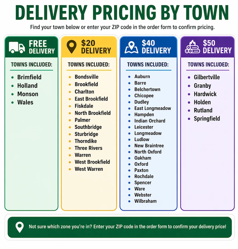 We provide firewood deliveries to Western and Central Massachusetts communities